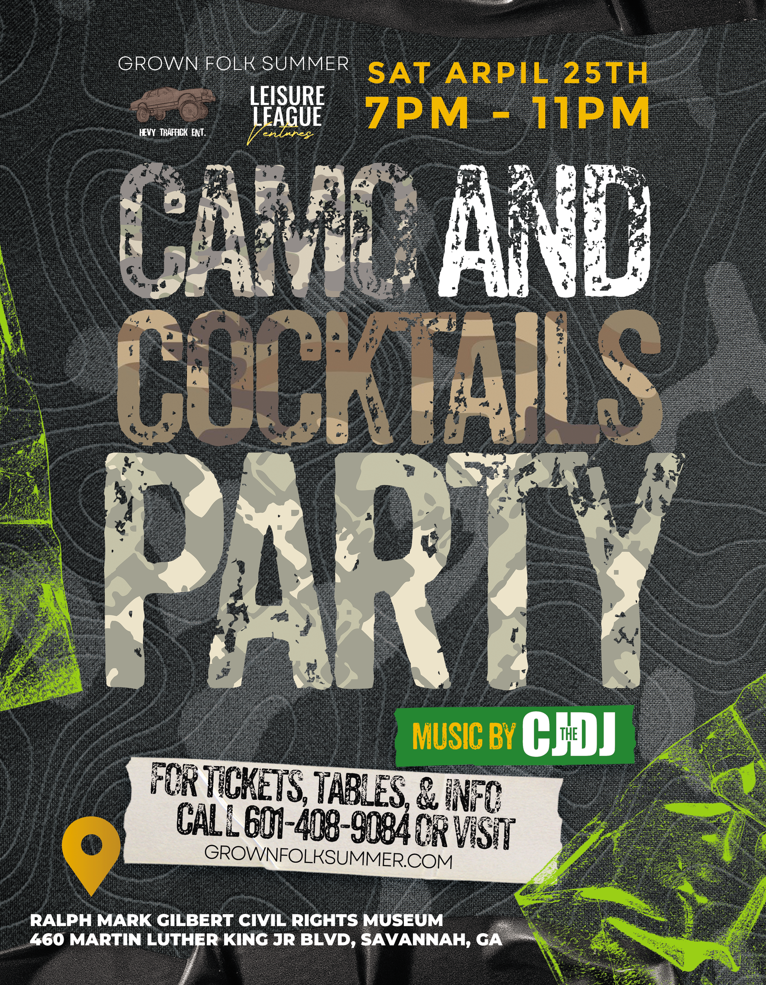 Pull out your best camoflauge and come have a few cocktails paired with a good time! CAMO & Cocktails features drink specials, tables, bottles, & music by CJ The DJ!
