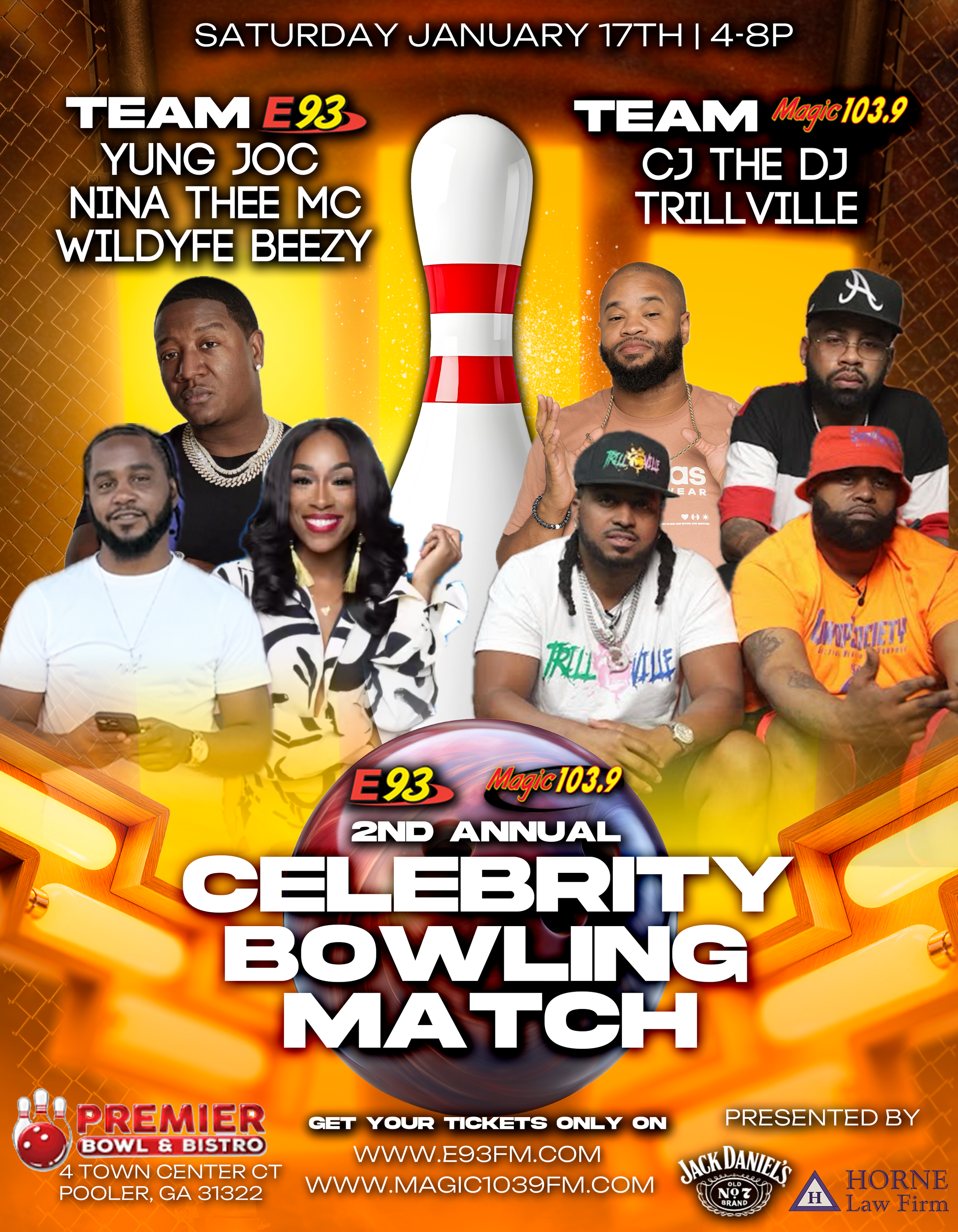 Savannah radio stations e93 and Magic 103.9 are battling it out on the lans with their 2nd annual Celebrity Bowling Match! The event features “Team E” consisting of YUNG JOC, midday talent nina, and wildlyfe beezy taking on “TEAM MAGIC” made up of CJ the DJ and TRILLVILLE. IT GOES DOWN FROM 4-8PM AT PREMIER BOWL AND BISTRO IN POOLER.