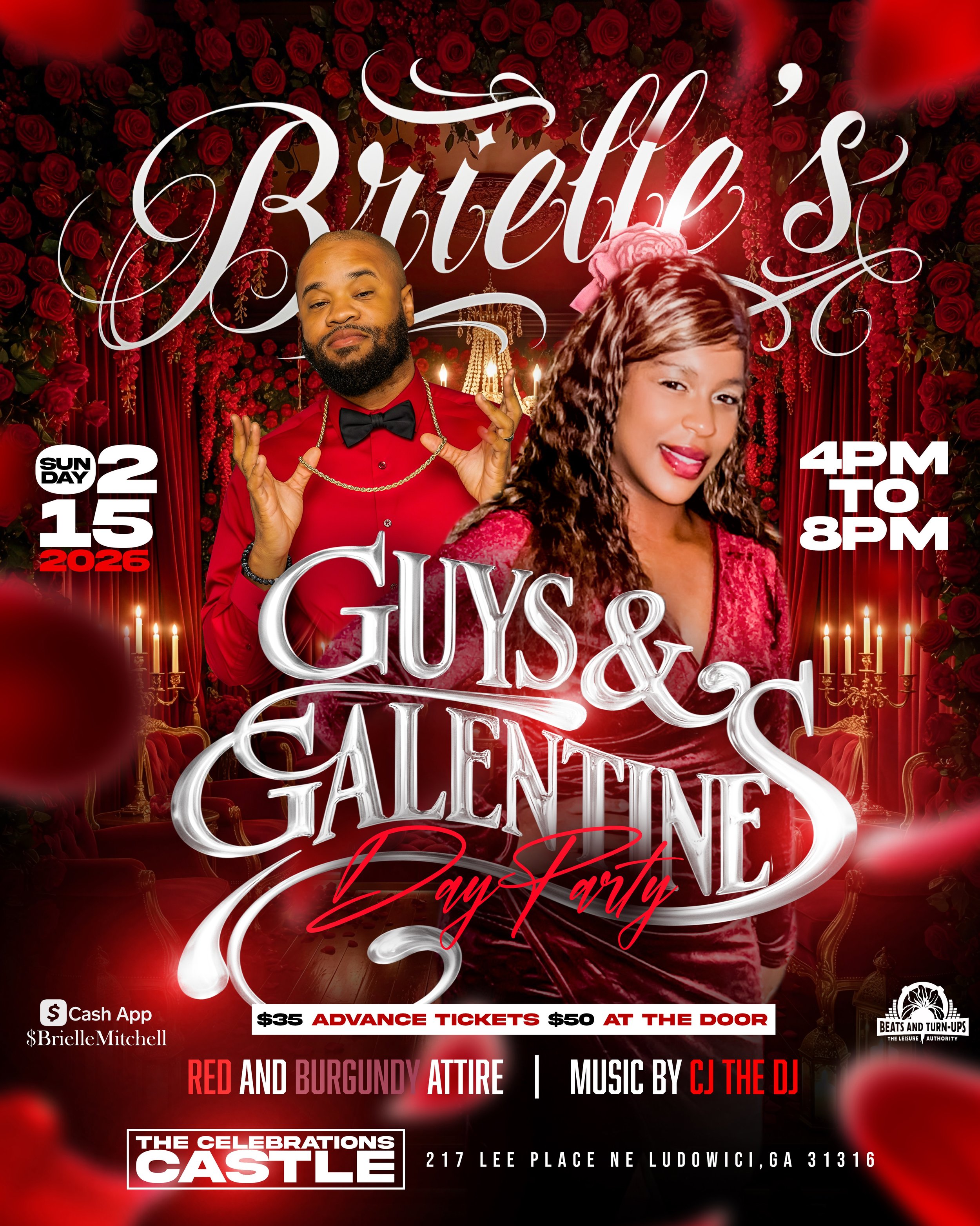 Back to All Events Guys & Galentines Day Party Sunday, February 15, 2026 4:00 PM 8:00 PM The Celebrations Castle 217 Lee Place Road Ludowici, GA, 31316 United States (map) Google Calendar ICS The Celebration Castle presents “Brielle’s guys & galentines day party”. this day party features food, drinks, photo booths, music by cj the dj and takes place inside an ACTUAL CASTLE!For Tickets, Details, and more contact Brielle at 843-941-2052
