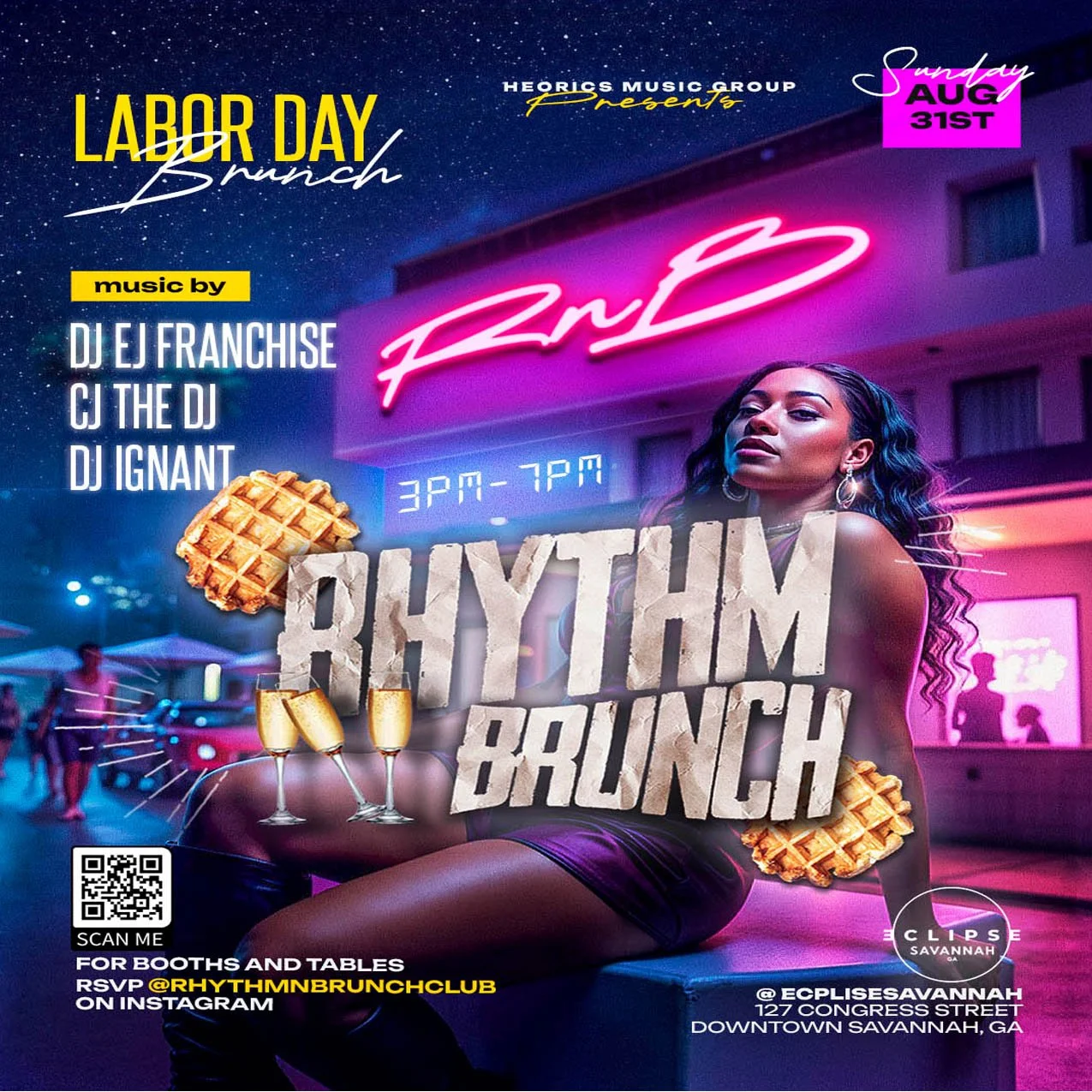 Back to All Events Rhythm n Brunch Sunday, August 31, 2025 3:00 PM 7:00 PM Eclipse Savannah 127 West Congress Street Savannah, GA, 31401 United States (map) Google Calendar ICS The Rhythm N Brunch Club are back this labor day weekend at Eclipse Savannah! Come enjoy food, RnB, (and a few Sophisticatedly Ratchet Vibes) from 3-7pmsections and tables are available. reserve yours on instagram @rhythmnbrunchclub
